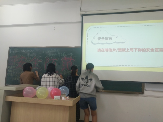 本次班会共分为三部分:精彩节目表演、暖心贴士讲解以及安全宣言宣誓。首先是节目表演环节,同学们以寝室为单位带来了多彩的表演,有自编自导的“校园贷”主题小品、有郎朗上口的安全知识三句半、有声情并茂的《珍惜生命 勿忘安全》诗朗诵以及幽默风趣的双人相声……大家通过欣赏节目既收获了乐趣,又丰富了安全知识,寓教于乐。紧接着是安全贴士普及部分,同学们将日常生活中的安全防范小知识进行了归类,内容涉及防盗、防推销、防网络诈骗等多个方面,讲解过程中结合生动实例,再一次为同学们敲响了警钟。最后,是安全宣言环节,经过前面两个环节同学们表示感慨良多,受益匪浅,纷纷在黑板和明信片上写下了自己提高警惕的决心,与大家共勉。