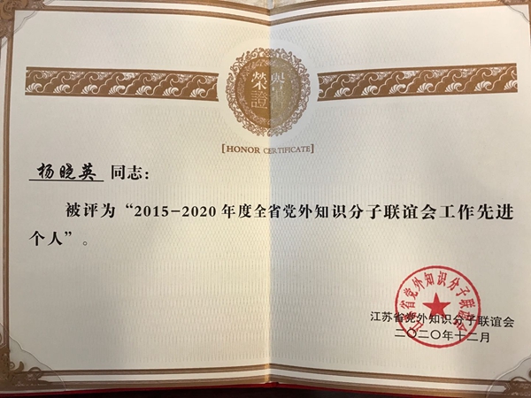近日,江苏省党外知识分子联谊会四届一次会员大会在南京召开。会议总结了过去五年工作,表彰了一批先进,对今后工作任务进行部署。省委常委、统战部部长杨岳出席会议并讲话。公司杨晓英副教授被授予20152020年度全省党外知识分子联谊会工作先进个人”称号。