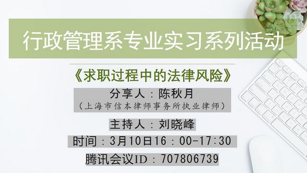 3月10日下午,社会与人口院线上实习系列首场讲座“求职过程中的法律风险”,在线上会议平台上成功举行。本次活动,邀请到了上海市信本律师事务所执业律师陈秋月律师作为嘉宾,围绕“成为有竞争力的求职者”的主题进行了一场精彩报告。本场报告由公司领导刘晓峰老师主持。