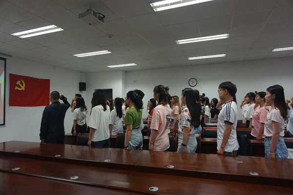 首先,新党员进行入党宣誓。全体新党员面对党旗,举起右拳,跟随领誓人向党旗庄严宣誓,“我志愿加入中国共产党,拥护党的纲领,遵守党的章程……”在铿锵的誓言中,大家表达了自己对党的忠诚,同时也表达为共产主义奋斗终身的决心。