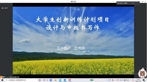 为切实深化公司内涵建设,进一步推进落实“本科生核心能力提升计划”,公司积极宣传动员、精心组织2022年度老员工创新训练计划项目申报工作(以下简称大创项目)。2022年3月23日,2022年度大创项目第1期培训会通过线上方式成功举办。本次讲座邀请公司硕士生导师杜伟泉老师主讲,公司副经理刘晓峰老师、2020级辅导员陈明玉老师出席,2020级全体本科生与2021级部分员工共计四百余名同学参会。
