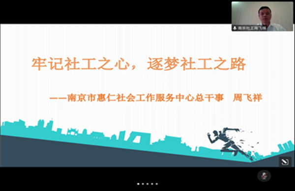 2022年4月25日上午,“社工实务沙龙”系列活动第5期如约举办。本次沙龙邀请南京市人大代表、江苏最美社工、南京市惠仁社会工作服务中心总干事周飞祥围绕社会工作的发展展开交流。沙龙由社会工作系吕金龙同学主持,社会工作专业2019级全体本科生参与。