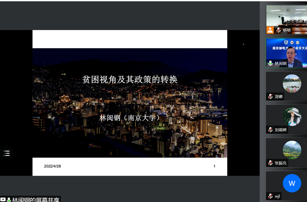 2022年4月28日下午,中国社会保障学会副会长、南京大学政府管理公司博士生导师、南京大学社会保障研究中心主任林闽钢教授应邀在公司社会学大讲坛进行了题为“贫困视角及政策的转换”的线上学术讲座。讲座由太阳成集团122ccvip副经理李朝祥教授主持,太阳成集团122ccvip副经理张振亮、公司部分老师、研究生、本科生通过线上线下的方式共同聆听了报告。