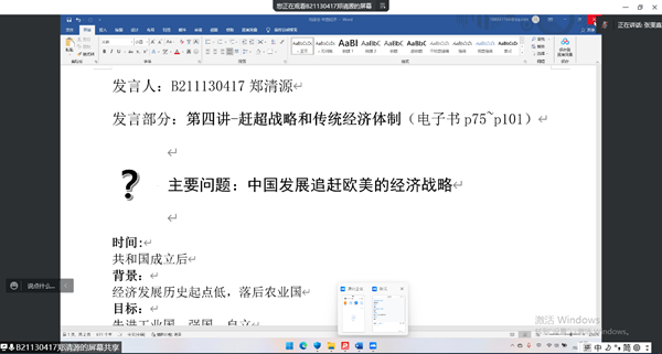 张雯熹老师首先向参会同学介绍了本书作者、著名经济学家林毅夫先生的教育背景、工作经历以及研究方向,为同学们分析了本书主要框架与行文逻辑,并结合自身研究内容讲解了本书成文的时代背景。在员工发言环节,公司本科生甘骏同学分析了中国近代为什么没有出现工业革命的历史原因,并总结了当前中国经济发展的机遇和挑战。郑清源同学与杨佳晔同学分别从改革开放以来中国经济追赶欧美的经济战略和20世纪下半叶东亚经济成功的原因入手,分享了林毅夫先生对于中国经济的战略解读和发展预判。孙克浦同学结合相关论著,介绍了我国农村改革与城市改革的发展历程与经验教训。王廷莹同学和纪欣悦同学分别以我国金融市场改革和金融危机后的经济形式与经济复苏为主题,讲解了我国金融市场有序发展的宏观政策与大局战略。张雯熹老师对同学们的发言一一给予了点评与肯定,张老师表示,希望同学们将专著类书籍的阅读与自身对社会的感受与体会相结合,从而更加深入的认识社会、解读社会,提升自身学术思维与学术素养,以期学有所悟、学有所成。