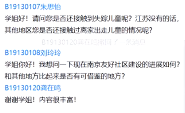 分享结束后,同学们就疫情期间的儿童保护挑战、失踪儿童问题和南京市友好社区建设进展等方面问题与何老师展开了深度交流。通过本次讲座,同学们加深了对儿童社会工作实务的认识,通过大量实务案例了解了社会工作的价值观与社会意义,坚定了学科自信与专业认同,纷纷表示希望未来能在社会工作领域有所作为,为推进现代化社会的建设贡献自己的力量。