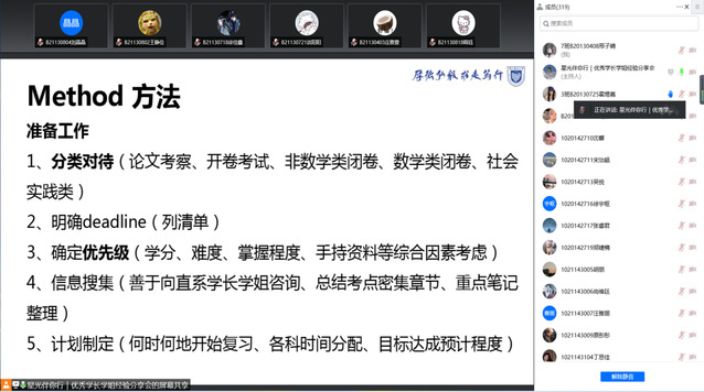 洪欣宜分享其留学申报经验,她表示留学申报过程中要明确时间线和院校选择,提早做好准备;在公司申请过程中,雅思考试和文书写作是最关键的部分。陈丹丹学姐分享了其求职经验,她建议求职同学要充分挖掘互联网招聘资源,根据自身条件及兴趣投递简历并积极参加面试;求职中要积极进行心理暗示,坚持下去定能收到满意offer。