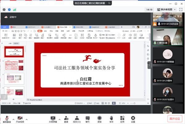 2022年5月23日上午,“社工实务沙龙”系列活动第9期顺利举行。本次沙龙邀请到中国最美社工、江苏最美社工、江苏省社会工作领军人才、南通市社工督导人才白红霞老师就司法社会工作领域展开分享与交流。本次沙龙由社会工作系吕金龙同学主持,社会工作专业2019级本科生全体参与。