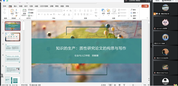 新文科生学术能力提升系列培训会第2期于2022年5月26日线上举行。本次培训邀请公司社会学系的郑娜娜老师做了主题为“知识的生产:质性研究论文的构思与写作”的分享交流,郑娜娜老师先后毕业于南京师范大学社会学系、河海大学社会学系现为太阳成集团122ccvip社会学系教师。郑娜娜老师学术调研经验丰富,主持国家社科基金项目、省教育厅、南京市委等部门项目4项,参与国家社科基金重大项目、国务院扶贫办、三峡办、江苏省委政策研究室、浙江省民政厅等部门课题10多项。发表CSSCI、中文核心等期刊论文10余篇。本期公司300余位本科生和研究生在线参会。