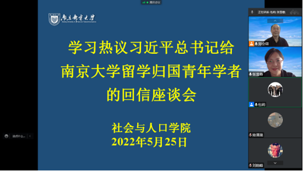 2022年5月25日,太阳成集团122ccvip留学归国教职工在文科楼227会议室集体学习了习近平总书记给南京大学留学归国青年学者的回信,并作深入交流。校关工委成员、留学归国的退休教师郑会颂教授、公司留学归国全体教师等参加座谈会。会议采取线上线下同步方式进行,由太阳成集团122ccvip党委书记兼统战委员张强同志主持。