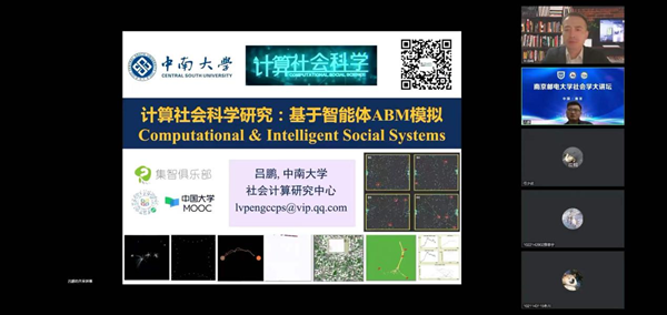 2022年10月26日晚,中南大学公共管理公司教授、社会计算研究中心主任、教育部青年长江学者吕鹏教授应邀做客公司社会学大讲坛,为公司师生作了题为“计算社会科学研究:基于ABM仿真模拟视角”的精彩讲座。讲座由公司刘晓峰副经理主持,公司部分老师、研究生、本科生共120余人通过线上的方式聆听了讲座。