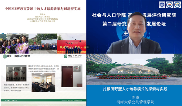 在论坛主题发言阶段,南京大学社会建设与社工研究院经理彭华民教授发表了题为《中国MSW发展中人才培养政策与实施》的报告,指出社会工作硕士专业学位教育的重要贡献,还从多个维度分享了如何对社会工作专业硕士研究生进行指导,并认为社会工作教育要坚持本土化、国际化以及专业化相结合,全方位推动社会工作教育的发展,建设好社会工作专业硕士人才培养的制度。华东理工大学社会与公共管理公司副经理杨发祥教授做了题为《理工科院校文科研究生高质量发展路径》的报告。杨教授从长三角区域发展和理工科院校背景的角度,并结合华东理工大学在团队建设方面的经验,探究了理工科院校文科研究生高质量发展的路径。南京师范大学社会发展公司副经理杨光飞教授分享了《体系化阅读、方向引领与研究能力提升》的报告,结合南京师范大学培养体系对研一、研二员工的因材施教观点进行了分享。河海大学公共管理公司副经理陈涛教授做了《扎根田野型人才培养模式的探索与思考》的报告。陈教授结合河海大学公共管理公司的基本情况,从聚焦扎根田野角度介绍了培养社会学研究生的宝贵经验。