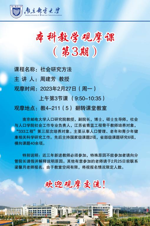 2023年2月27日,公司第三期“本科教学观摩课”活动成功举办。本期教学观摩课由人口研究院副经理、社会工作专业负责人周建芳教授主讲。主讲课程为《社会研究方法》,授课形式为“翻转课堂”。包括近两年新进教师在内的十余位教师观摩了本次教学活动。