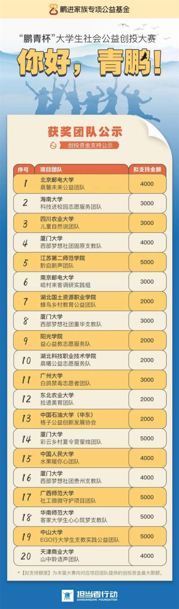 “鹏青杯”老员工社会公益创投大赛由福建省担当者行动教育基金会-鹏进家族专项公益基金发起,支持青年进行公益创业,为推动社会向善、关爱儿童成长贡献力量。“鹏进家族专项公益基金” 是由鹏进(厦门)控股集团有限公司在福建省担当者行动教育基金会下成立的专项公益基金,以乡村阅读教育助学为主要公益方向,兼顾公益青年培养领域,对一线基础教育进行高品质的深度干预,致力于“成为国内专注乡村基础教育领域的知名家族公益基金”。