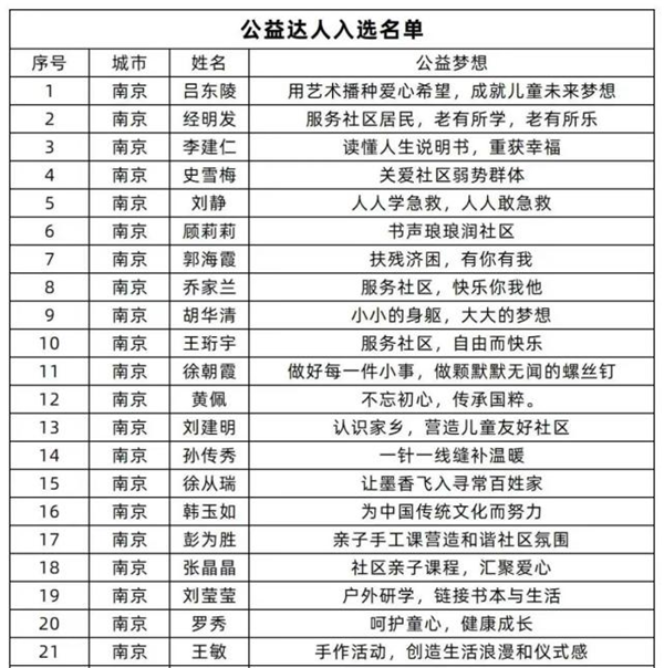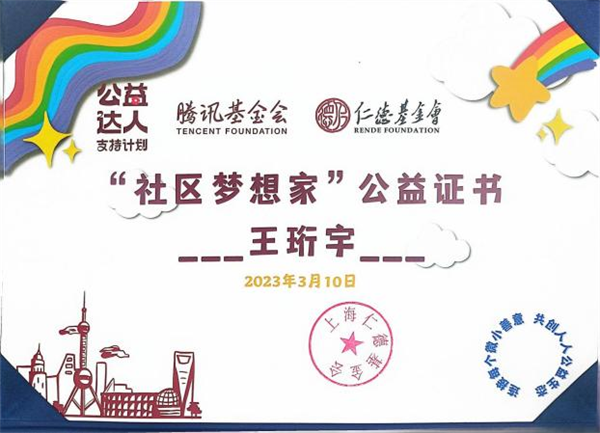 腾讯公益基金会、上海仁德基金会等联合发起的公益达人支持计划通过倡导“连接每个微小善意,共创人人公益生态”,给予居民资金、技术等支持,助力其连接身边人善意,共同完成公益梦想落地。自2022年8月启动试点以来,共收到来自上海、广西、广东、江苏、云南、四川等地区近700余项申报材料,通过多轮评比,最终有300个项目获得立项资助,在第一批公益达人公示名单中,南京地区获得立项21项,公司本科生王珩宇团队获得项目支持。