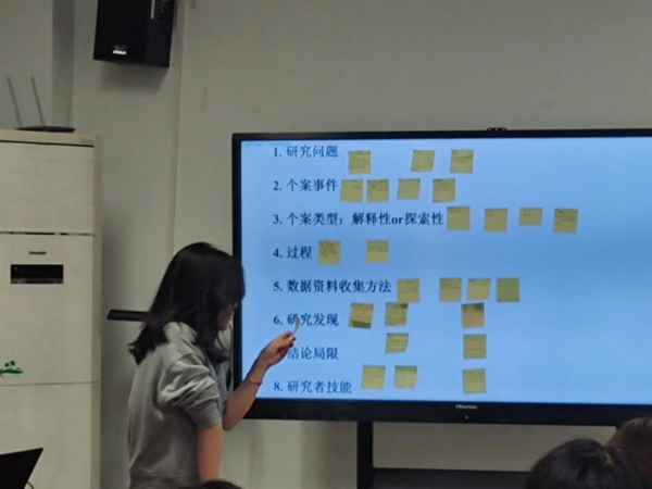 “悦读会”开始,沙老师向同学们讲述了书目的大概内容以及结构,强调阅读社会学著作需要分析其中的研究方法,并提到该书主要采用的是个案研究方法。沙老师为了能充分调动同学们的思考,将在场同学分成了四个组,并给出了八个讨论方面,分别是研究问题、个案事件、个案类型(解释性或探索性)、过程、数据资料收集方法、研究发现、结论局限和研究者技能,让每个组根据这八个方面对这本书进行分析,将各自小组的理解和讨论结果写在便利贴上。在各组同学进行了如火如荼的讨论和总结后,沙老师让每个组将便利贴贴在白板上,对每一个组得出的结果进行点评,并让小组成员解释为何得出这样的结果。沙老师对每位发言的同学都给予了肯定,并鼓励大家多多发言。最后,沙老师对大家的讨论结果进行了总结。