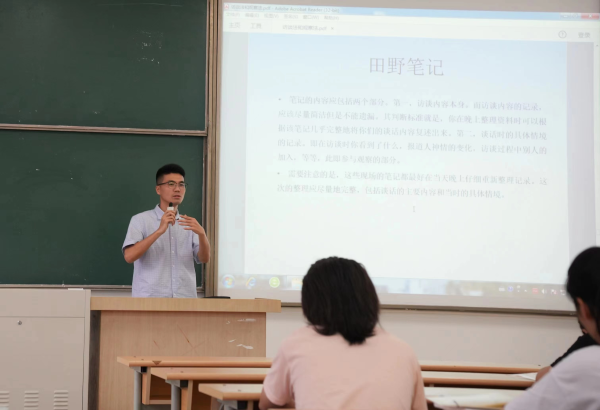 讲座伊始,许中波老师结合时事热点与自身经历,鼓励同学进行“科学的研究设计”,自然地引入对基础社会调查研究方法的介绍。对于实地研究的具体过程,许老师首先介绍了调研地区的选择以及进入方法,突出了以“上帝视角”进行研究的重要性。然后阐释了观察法的定义、特点、类型等以及访谈法的定义、分类与技能。为了使研究结论更接近真实,调研人员要注意与多方交谈,进行“三角验证”,以纠正可能存在的虚假信息。此外,在访谈中要注意倾听、回应,努力了解被研究者的所思所想,并及时撰写田野笔记,完整记录谈话主要内容和当时具体情景。