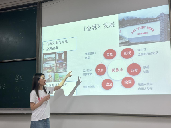 张静老师着重为大家介绍了《金翼》叙事方法、语言风格。她指出,《金翼》的故事叙述具有“多重式聚焦叙事手法”“铺垫式手法”“坚持人类学整体观”的特点,同时为在场同学们明晰了“民族志”的概念,使同学们受益匪浅。为了让同学们更深入的了解《金翼》,张静老师分享了她深入“金翼村”的经历,为大家介绍了“金翼村”在乡村振兴主题下的转型与发展,向大家展示“金翼村”在文化艺术方面取得的成就,正如书中所言“把种子埋进土里”,终有一天能收获希望。