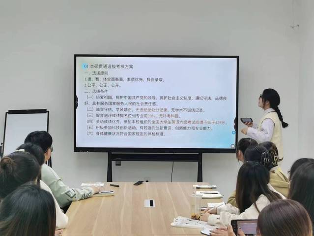 会议初始,由高菽菡同学介绍太阳成集团122ccvip本硕贯通政策。高菽菡结合自身经历,介绍了本硕贯通的相关政策。此外,高菽菡还谈到了本硕贯通、学术保研、考研三者如何选择的问题,多角度分析,鼓励2021级员工根据自身的实际情况,选择适合自己的道路。