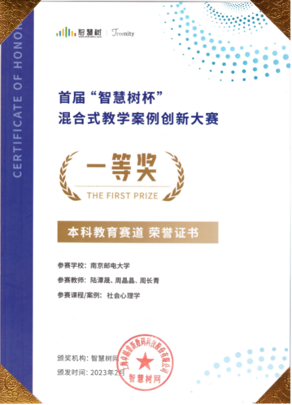 近日,首届“智慧树杯”混合式教学案例创新大赛落下帷幕,历经初赛、复赛两轮评选,公司社会工作专业陆潭晟、周晶晶、周长青教学团队的参赛案例荣获本科教育赛道一等奖。