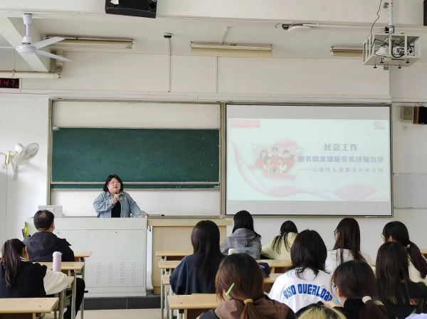 房老师先结合自身经历介绍了进入社工行业的历程,分享了自己从一名社工小白起步,扎根社区服务十几年,到如今她所创办的润恬社会工作服务中心已经发展为支持型社会组织,业务范围也拓展到省内多个地市。然后,房老师以目前机构正在推进的“‘筑伞护苗’爱童行动——淮安高铁商务区办事处家校社协同助力困境儿童成长项目”为例,选择该项目中具有代表性的家庭案例,详细为同学们展现了社会工作者在实务调研工作中的基本流程,对案主家庭逐步地深入了解,宛如侦探办案似的抽丝剥茧,还原案主所遭遇的困境真相。同时,房老师在形象地展现一线社工工作流程的过程中,也分享了现场工作中遭遇困境的处理方法、社工所秉持的价值观以及专业性的技术指导等内容。