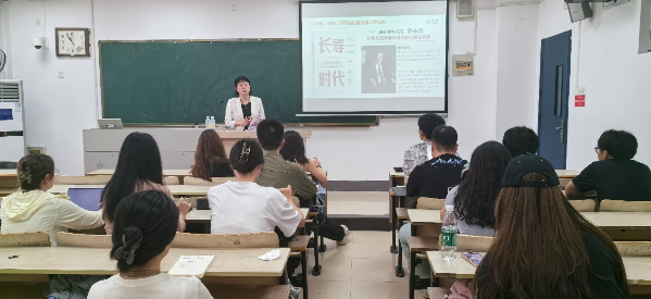王红老师首先以自身工作经历为引,以《长寿时代》这本书写作背景为突破口,讲述人口老龄化、高龄化背景下养老服务的重要性。她强调,在当前时代背景下,养老行业为同学们提供了广阔的发展空间。随后,王红老师详细阐述了本书作者、“92”派企业家代表陈东升的人生经历,并抛出一个引人深思的问题:老而贫病的人生是否值得追求长寿?