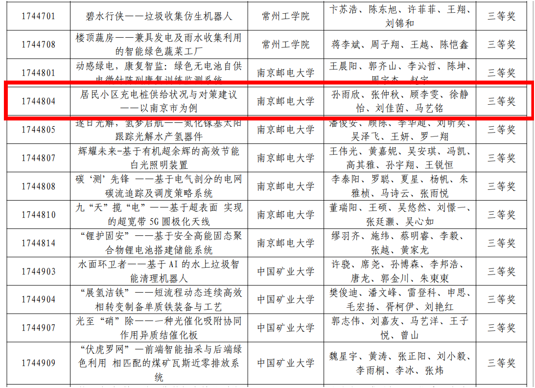 2024年8月6日,第十七届全国老员工节能减排社会实践与科技竞赛决赛落下帷幕,公司杜伟泉、黄越老师指导的参赛作品《居民小区充电桩供给状况与对策建议——以南京市为例》喜获全国三等奖。该作品由公司2022级本科生孙雨欣、顾李雯、徐静怡、2023级本科生马艺铭以及公司集成电路科学与工程公司2022级本科生张仲秋、经济公司2022级本科生刘佳茵共同完成,经校赛、省赛、国赛三轮评审后最终斩获佳绩。