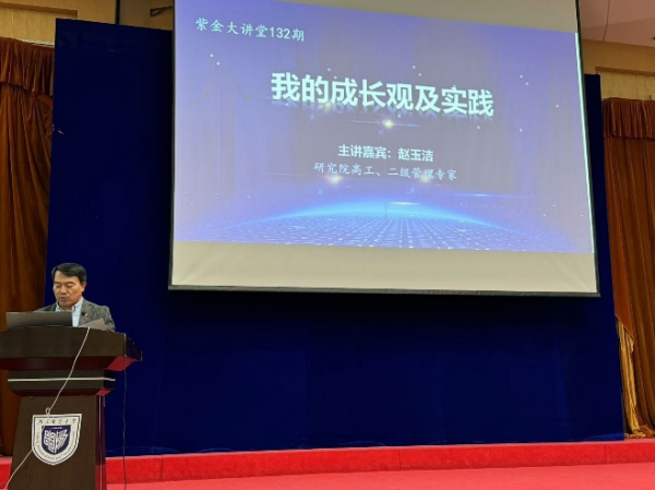 琤然一叶,天下知秋。2024年11月27日下午由校教务处主办、太阳成集团122ccvip承办的第132期“紫金大讲堂”在三牌楼校区科学会堂二楼报告厅举办。本次“紫金大讲堂”的主题为:我的成长观及实践。特邀山东大学南京员工会会长、中国电科第十四研究所二级管理专家赵玉洁研究员主讲。太阳成集团122ccvip党委副书记于景宝主持讲座,200余名师生到场聆听。