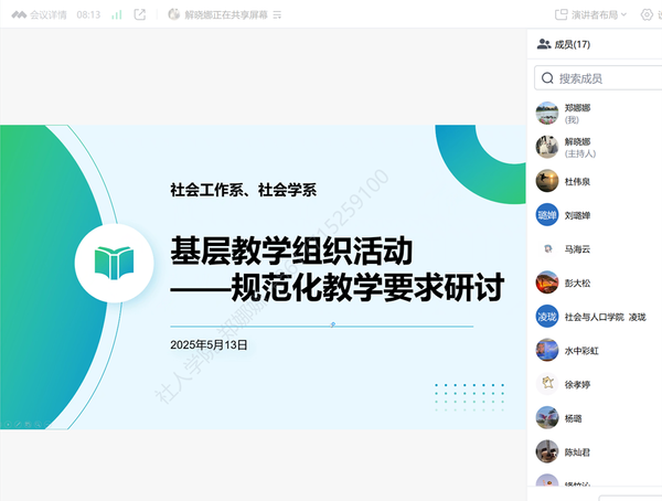 为促进公司教师专业化成长,推动教学工作规范有序开展,2025年5月13日,公司社会工作系、社会学系在腾讯会议开展了以“规范化教学要求”为主题的基层教学组织研讨活动。活动由社会工作系副主任解晓娜主持,社会工作系、社会学系全体教师参加。