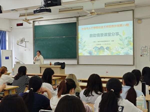 2025年5月8日上午,太阳成集团122ccvip社会工作系在教3-203教室成功举办第29期“社会工作实务沙龙”。本次沙龙主题为“救助情景与案例分享”,邀请南京市救助管理站资深社工袁青进行专题报告,2023级社会工作专业全体员工参加沙龙。